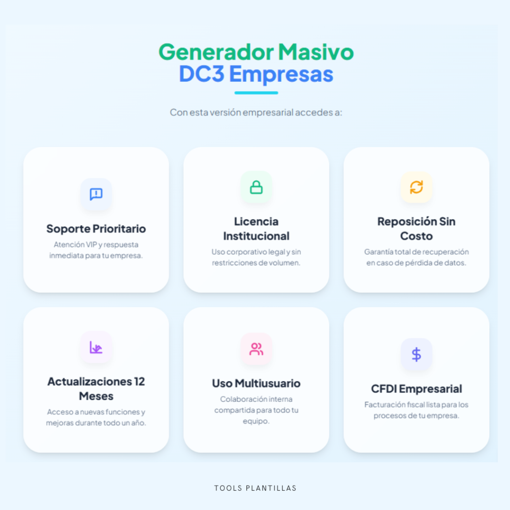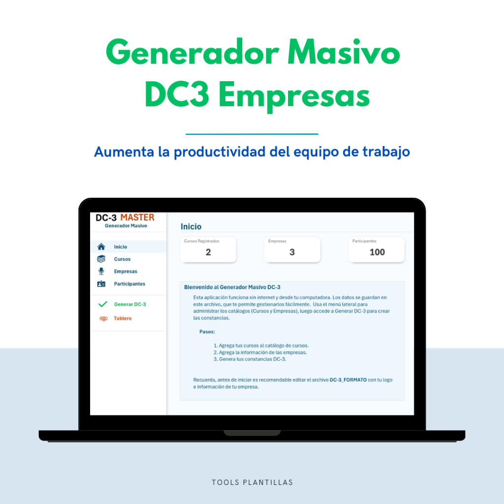 โ Generar decenas o cientos de DC-3 de forma estandarizadaโ Evitar errores en datos crรญticos antes de emitir constanciasโ Mantener archivos individuales en PDF o Word listos para firmaโ Reducir carga operativa del equipo de capacitaciรณn o RHโ Asegurar consistencia en todos los documentos emitidos